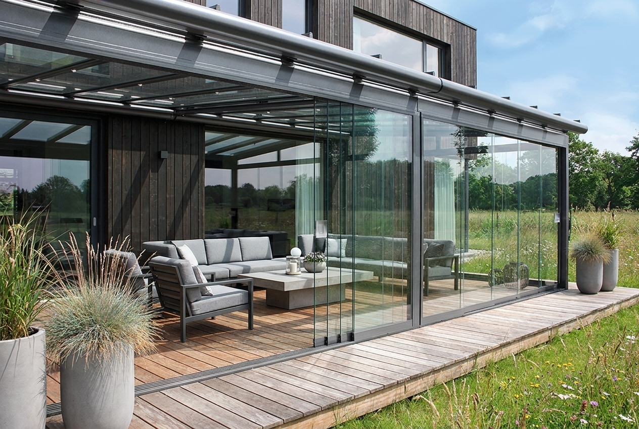 Schiebbare Glaselemente ermöglichen es, die Terrasse bei Bedarf zu schließen und ganzjährig zu nutzen.